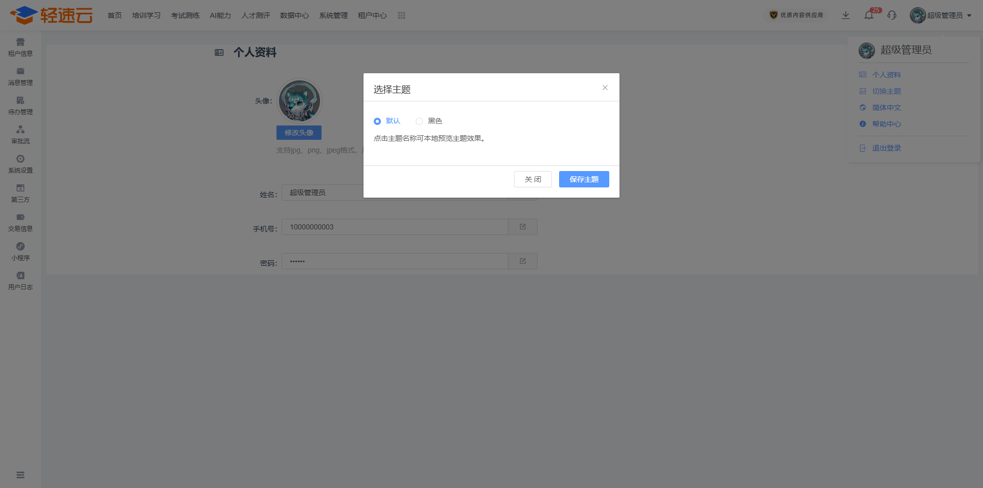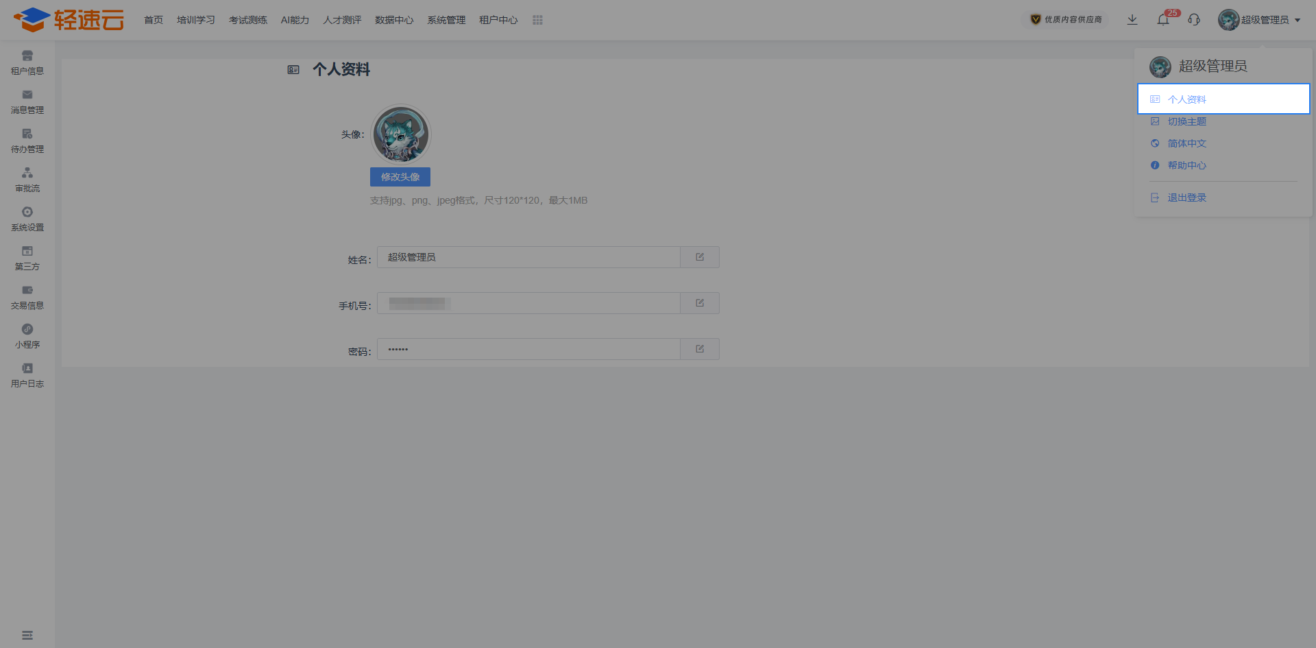 在系统管理后台点击右上角管理员信息,然后选择 个人资料 会进入到个人资料管理页面,可管理的信息为:头像、姓名、手机号、密码、绑定微信、绑定QQ。