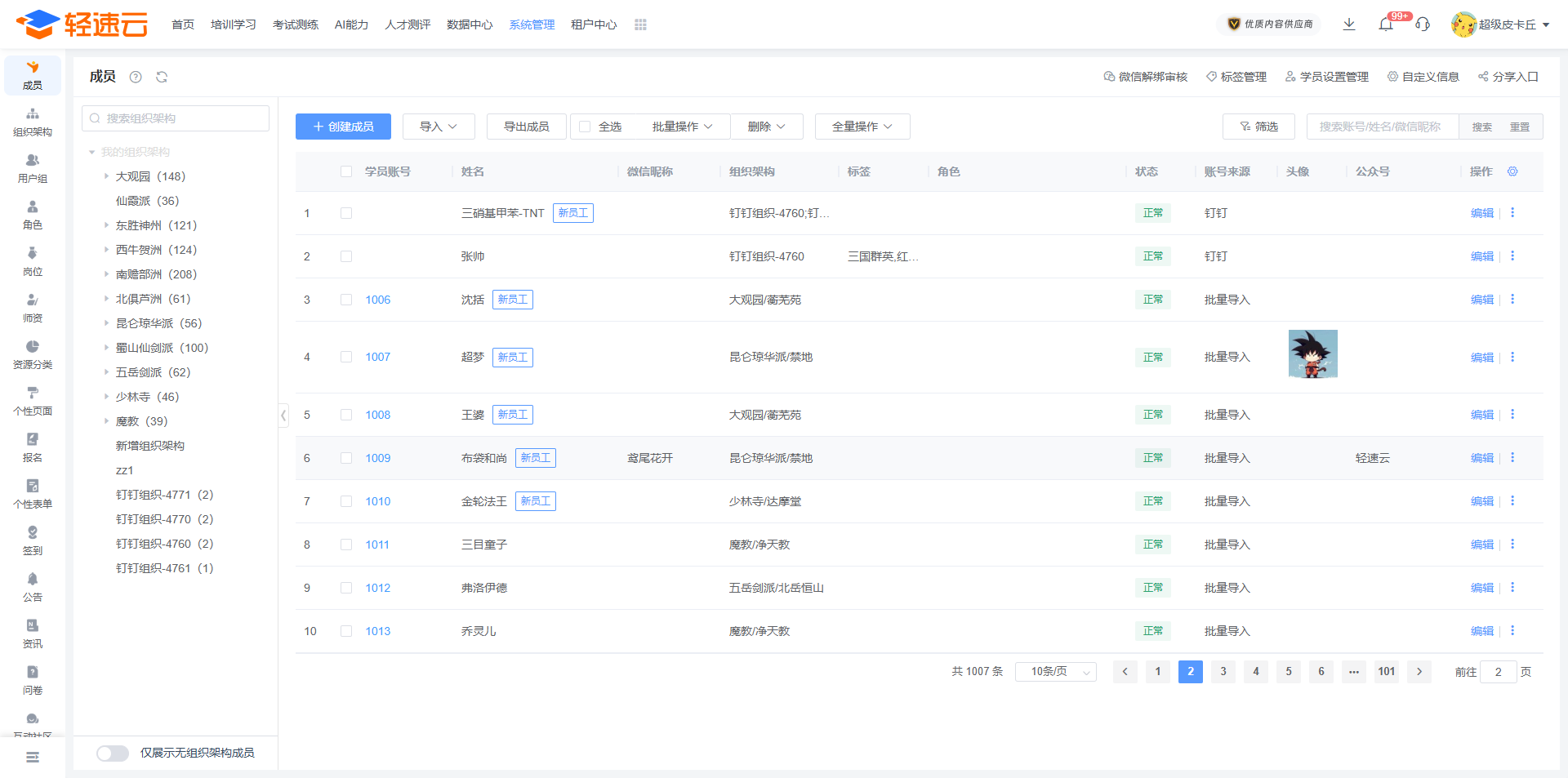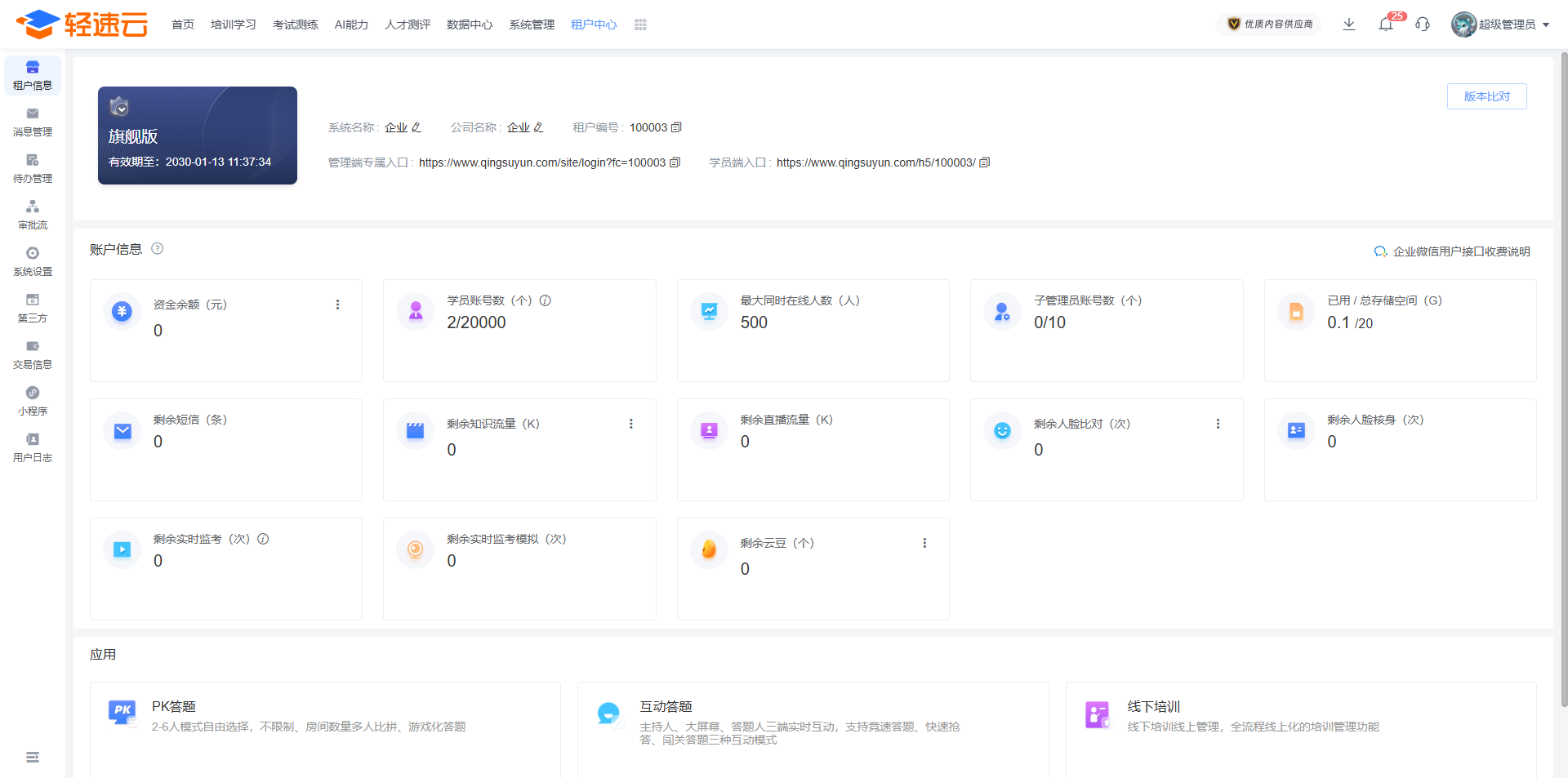 当前版本:显示当前的软件版本信息,不同版本所能够使用的功能会有差异。资金余额:显示账户的资金信息,资金来源途径为所有的收费项目。可以申请提现。点击卡片右上角┇按钮,还能查看收费明细情况。学员账号数:显示允许拥有的成员账号数量上限。当该信息达到上限时,您将不能通过任何方式来新增成员账号。仅统计状态为正常的成员数量。同时在线人数:显示允许同时在线的成员人数上限。当该信息达到上限时,所有成员都将无法正常使用系统。子管理员账号数:显示允许创建的 子管理员 数量。当该信息达到上限时,您将不能通过任何方式来新增子管理员;若现有子管理员数量超过上限,则所有的子管理员都将不能登录,直到您购买更多的子管理员数量或取消现有的子管理员。存储空间:显示您所能使用的总空间容量。在所有功能中上传的文件都会占用一定的存储空间,若您的存储空间不足,则上传会失败。短信:显示您所能够给成员发送短信的次数。发送消息、获取验证码等功能中会使用您的短信条数,若数量不足,则无法执行。剩余知识流量:学员进行在线学习播放音视频时会消耗流量。当剩余流量不足时,成员将无法进行学习。剩余直播流量:显示 直播管理 功能所能够使用的剩余流量,学员观看直播时会消耗流量。人脸比对次数:显示剩余人脸比对功能的次数。在考试、课程等功能中,如果启用了人脸比对设置,则学员每次比对,无论成功与否,都会消耗人脸比对次数。人脸核身次数:显示剩余人脸核身功能的次数。在考试功能中,如果启用了人脸核身设置,则学员每次验证,无论成功与否,都会消耗人脸核身次数。剩余实时监考次数:显示剩余考试实时监控视频功能可使用的次数。剩余实时监考模拟次数:显示剩余考试实时监控视频模拟功能可使用的次数。剩余云豆:AI相关功能中会消耗云豆。云豆不足时,将无法使用AI功能。