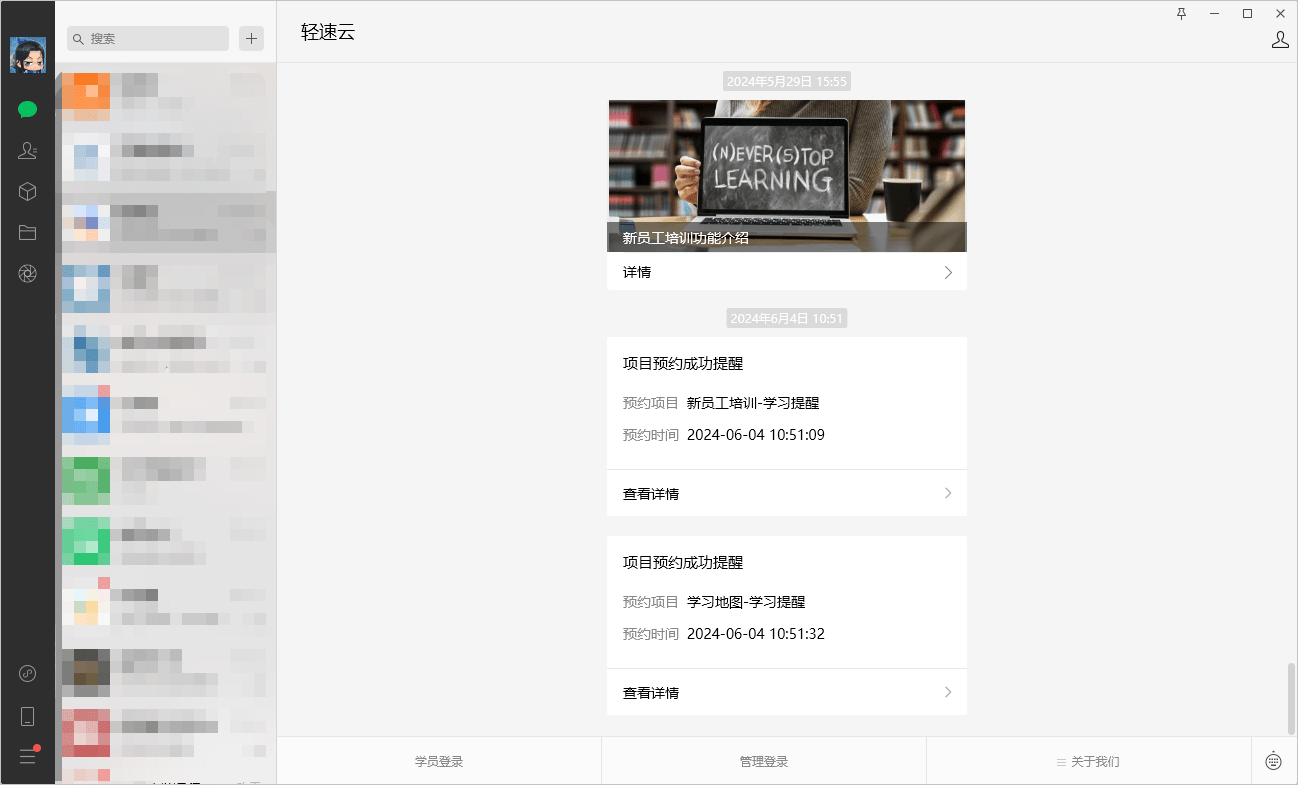 拥有微信公众号信息并完成授权绑定后,您可以通过微信公众号向成员推送考试、课程等消息通知。