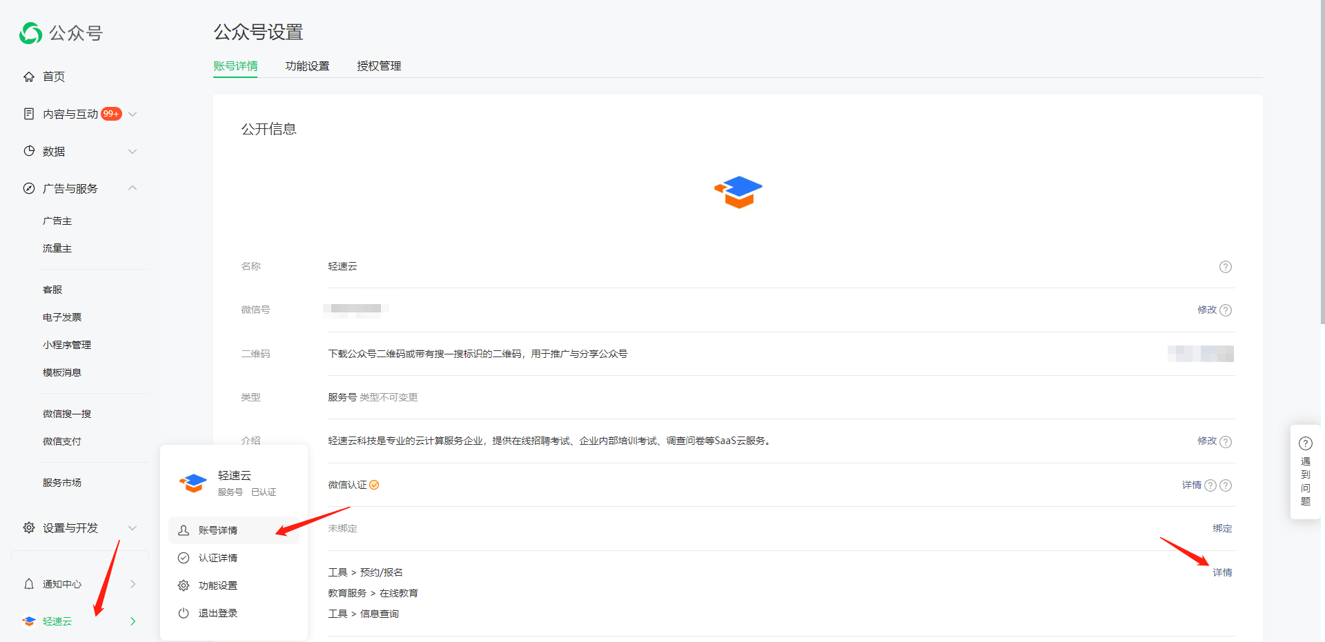 1、已授权绑定微信公众号,公众号类型需为 服务号 且已通过微信认证。