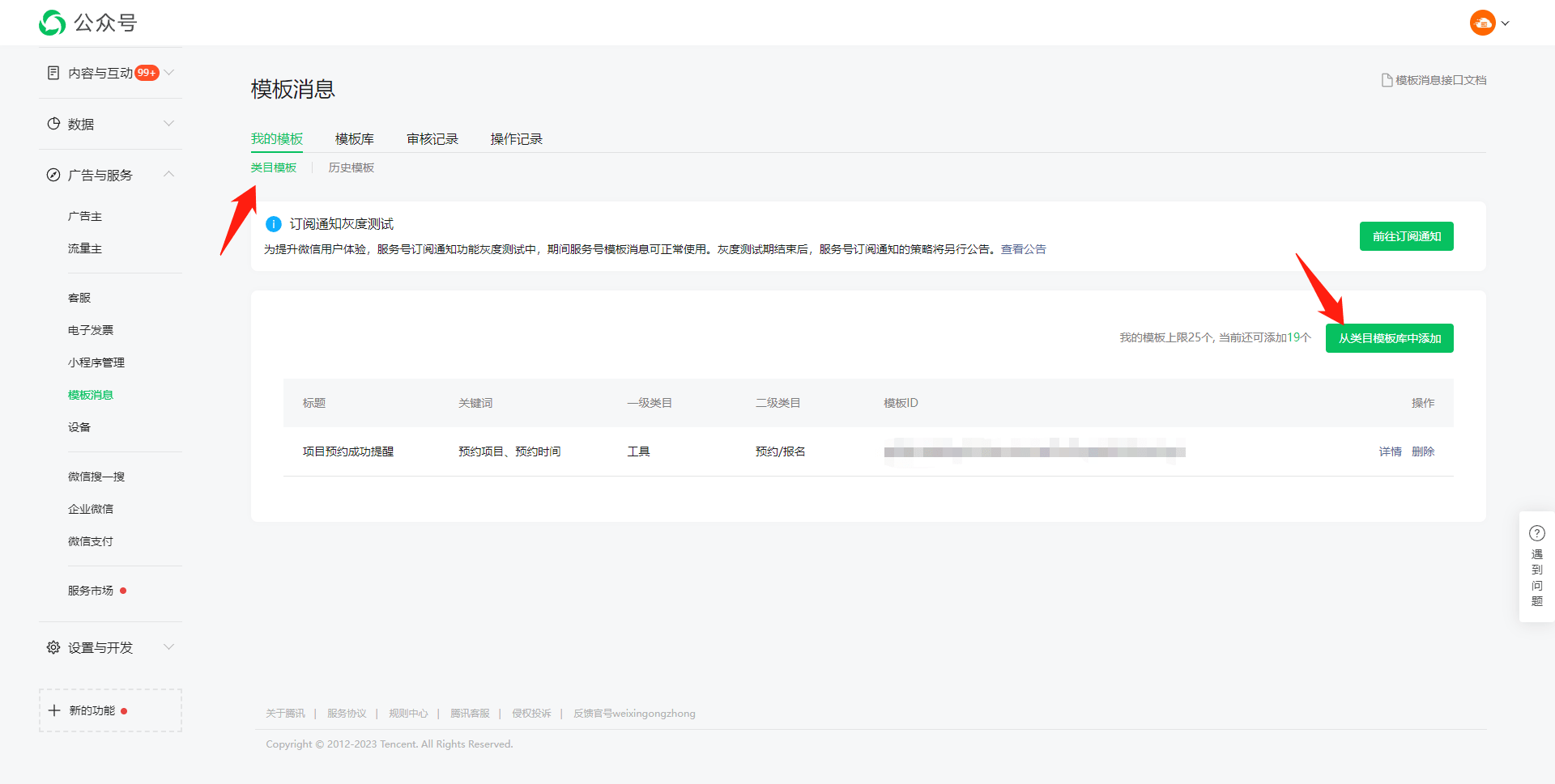 获取消息模版ID的方式如下: