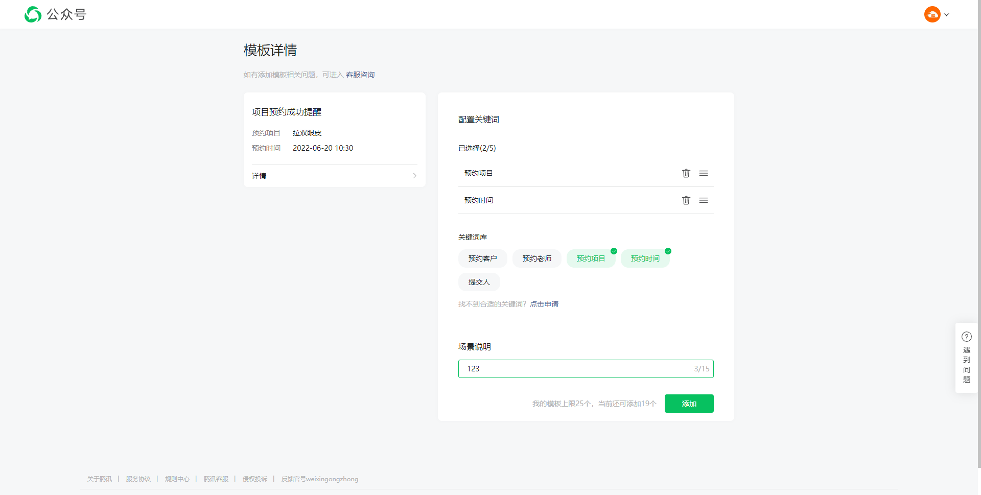 在模版详情页面,选择需要添加的字段,这里需要添加 预约项目 和 预约时间 ,然后填写场景说明,点击 添加 。