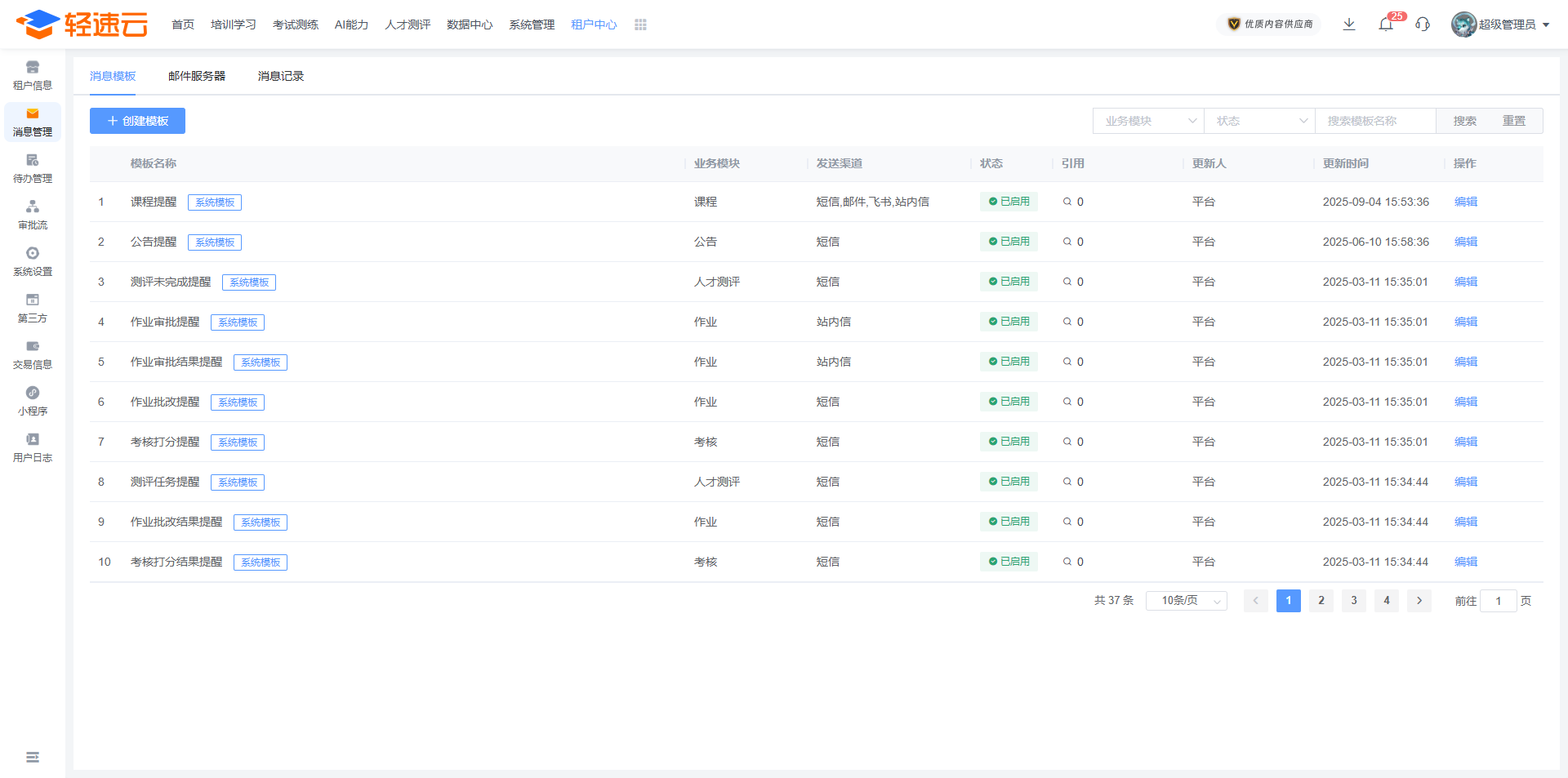 针对不同的功能模块,系统均提供默认的基础模版,也可根据实际使用需求创建或编辑新的消息模版。默认模版无法被删除。