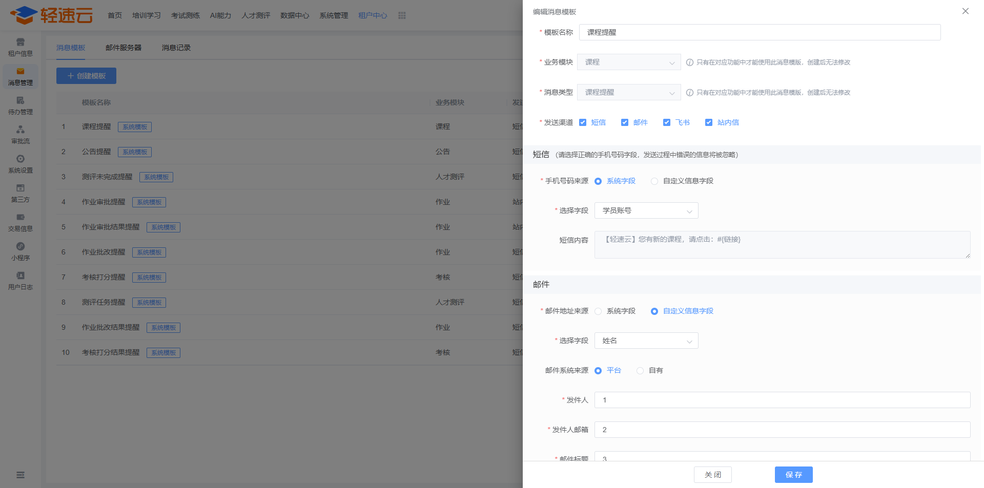 所有消息模版在配置时,请注意选择正确的信息字段,错误的数据在实际发送消息时将被自动过滤。消息发送渠道为 邮件 或 微信公众号 时,还需要进行额外的配置。