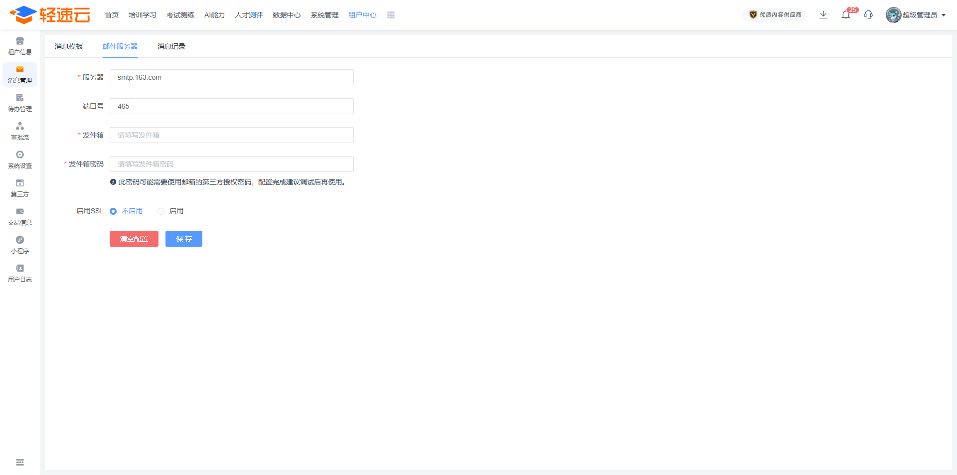 获取邮件授权密码后,将其填写到轻速云管理后台 发件箱密码 一栏。