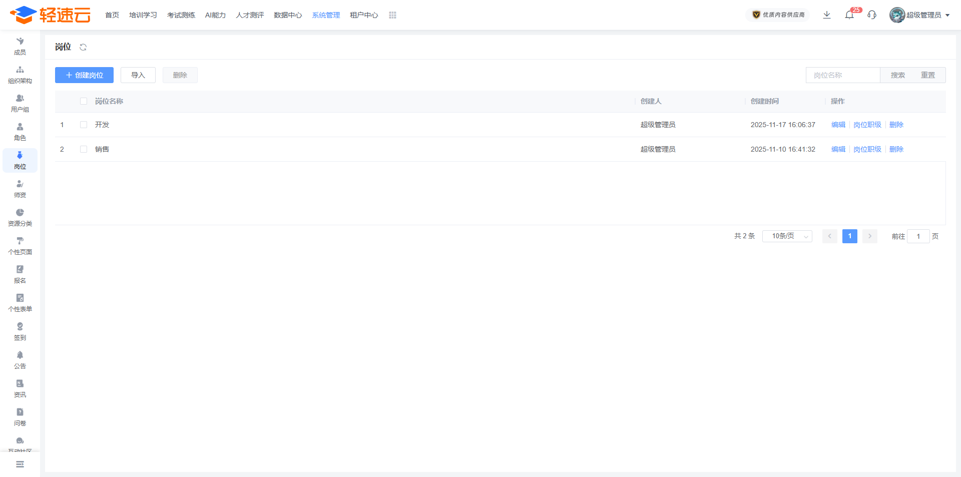 岗位支持单个创建或批量导入。批量导入岗位时,还需要一并设置岗位职级,岗位职级仅供展示。