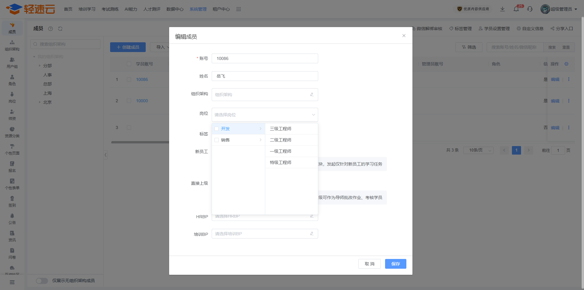 岗位职级可以通过考试进行变动,详情请参考 考试设置 。
