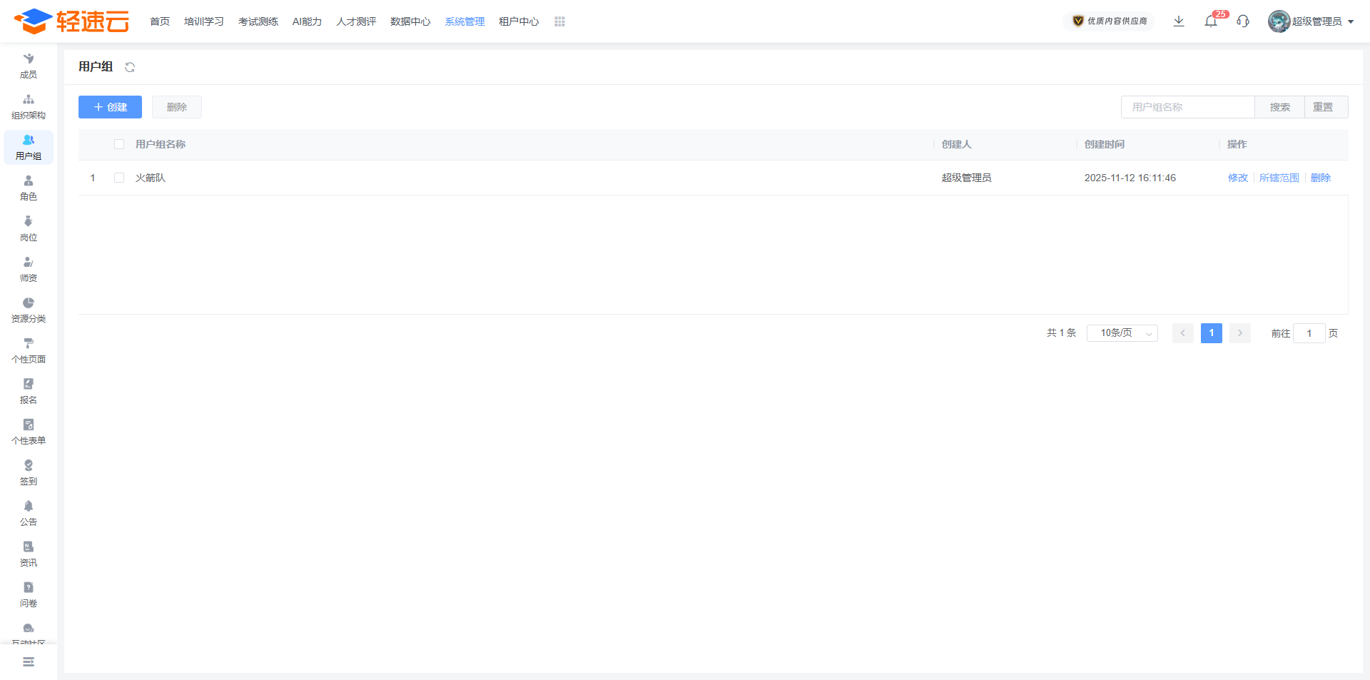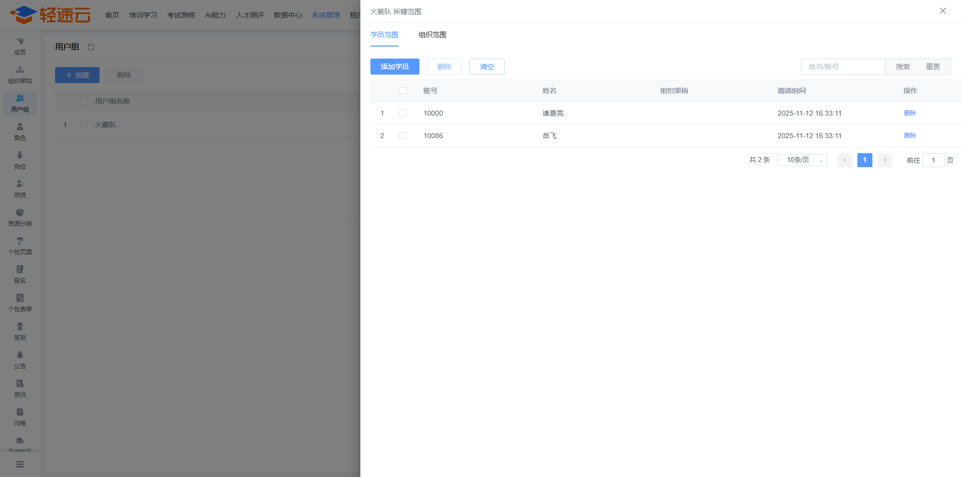 用户组是一些用户的集合,可以将多个人员和部门信息划入一个用户组进行统一管理。在考试、学习地图、新员工培训等功能中,支持按照用户组进行邀请。